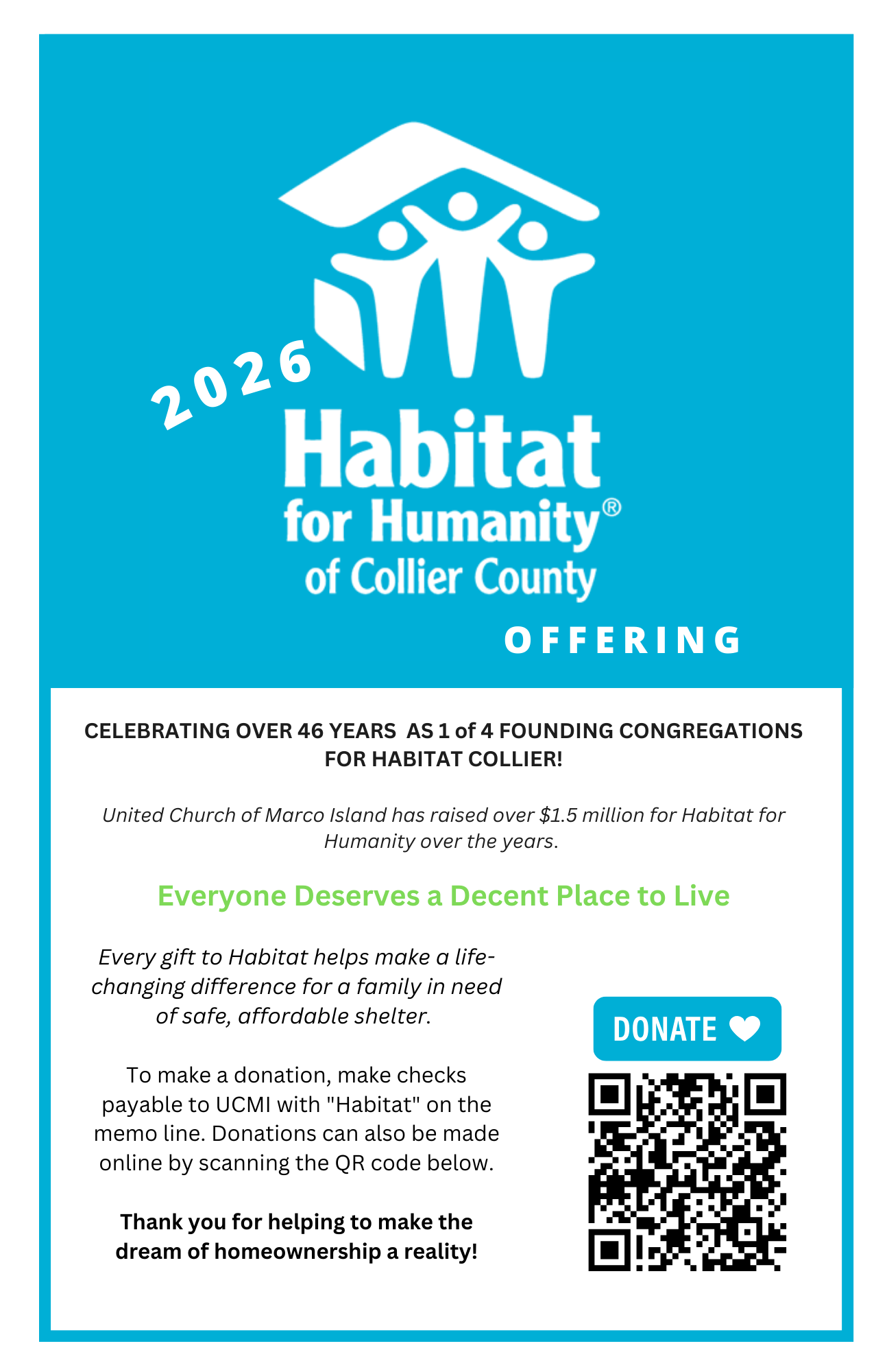 United Church of Marco Island is supported by the generosity of God's people. Our giving brings us great joy. In giving to God's church and to those in need, we help others experience heaven on earth. Indeed God loves a cheerful giver: "Each of you should give what you have decided in your heart to give, not reluctantly or under compulsion, for God loves a cheerful giver." (2 Corinthians 9:7)
